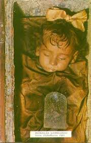 Y entre todas, una figura destaca de entre las demás, el cuerpo de la pequeña Rosalía Lombardo, una niña de 2 años que parece estar sumida en un infantil sueño del que se diría puede despertar en cualquier momento, ya que a veces, sus pequeños ojos se entreabren para volverse a cerrar a los pocos segundos.
