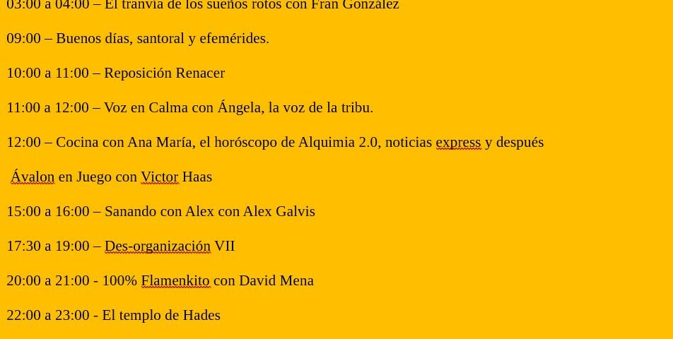 SERÉNATE: Lo que te calma, te transforma26 de marzo de 2026Programación fin de semana27 de marzo de 2026 Show all Programación viernes 27 Share Fran González Formador, escritor, comunicador y divulgador. Página de Autor: https://t.co/iI2m5IUqpv Related posts30 de marzo de 2026CAMINANTESRead more Deja una respuesta Cancelar la respuestaTu dirección de correo electrónico no será publicada. Los campos obligatorios están marcados con *Comentario * Nombre * Correo electrónico * Web Guarda mi nombre, correo electrónico y web en este navegador para la próxima vez que comente.