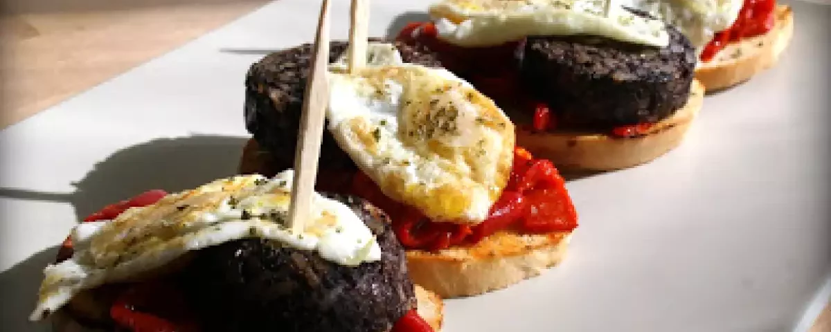 Esta es una tapa clásica española, fácil de preparar y perfecta como aperitivo. Se trata de una tosta o pincho con base de pan tostado, morcilla frita o asada, pimientos y un huevo de codorniz encima. Aquí te detallo una versión sencilla basada en recetas tradicionales.
